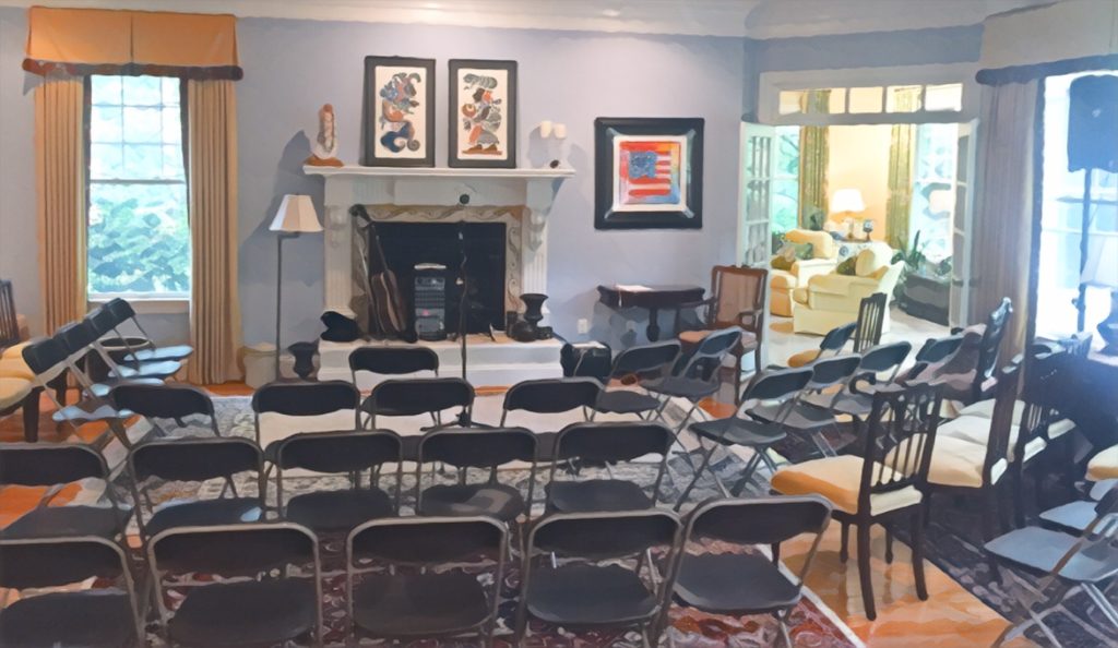 The host or hostess provides the House Concert location and seating, and invites 20 or 30 people to attend. Guests are asked to make a donation to the band ($20 per person is customary) and to bring a dish to share.
